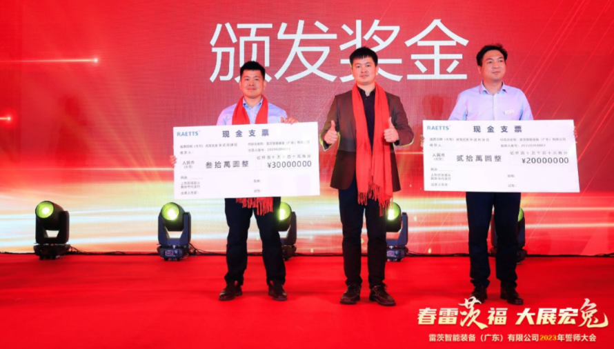 誓師大會上,表彰了優(yōu)秀的供應商、經(jīng)銷商、最佳團隊和優(yōu)秀員工,發(fā)放2022年終獎金150萬元,分別獎勵廣東、江蘇、北京銷售冠軍200萬元,合計發(fā)放獎金350萬元。