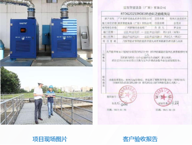如廣州新塘污水廠在應用三臺雷茨磁懸浮185kW風機之后,節(jié)能顯著提高,在電價上漲15%的情況下,耗電仍有所回落,也不再有噪音投訴。